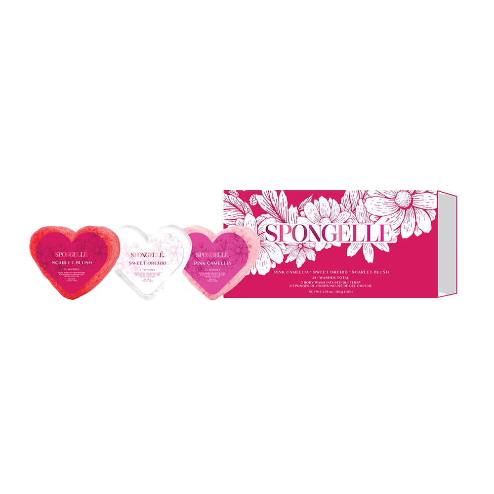 Introducing Spongellé's Heart Travel Buffer Gift Set. These heart-shaped body wash infused buffers are designed to add a touch of love to your daily cleansing routine. Infused with soft floral fragrances, these buffers transform your shower into a heartwarming experience. Treat yourself or someone special to these charming buffers and spread the love any time of year! Gift set includes three of our bestselling, travel-size heart buffers in Scarlet Blush, Pink Camellia, and Sweet Orchid. Good for 7+ washes each.