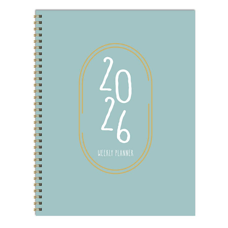 Keep all your plans in line with our pretty blue 2025 planner! Measuring 9" (w) x 11" (h), this all-encompassing 2025 large weekly monthly planner boasts monthly, 2-page spreads that include lined sections for notes, tasks, and goals and weekly, 2-page spreads with lined daily sections to keep plans neat and organized, plus a dedicated weekly priorities section to help keep you focused. The interior pages are designed with a cheerful feel, accented with faux monthly tabs for easy access to weekly planning. Enhance your daily plans with 368 color coordinating stickers to highlight special occasions and personalize your planner. Bonus lined notes pages are in the back with yearly 2026 and 2027 views in the front. The monthly boxes measure 1.5" (w) x 1.75" (h). Featuring a durable robin's egg blue cover and sophisticated, gold wire-o binding designed to lay flat when open, this 12-month planner covers January 2026 – December 2026 and contains no plastic. Printed on FSC-certified paper.