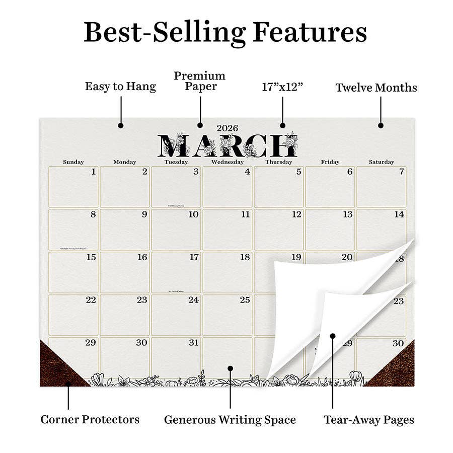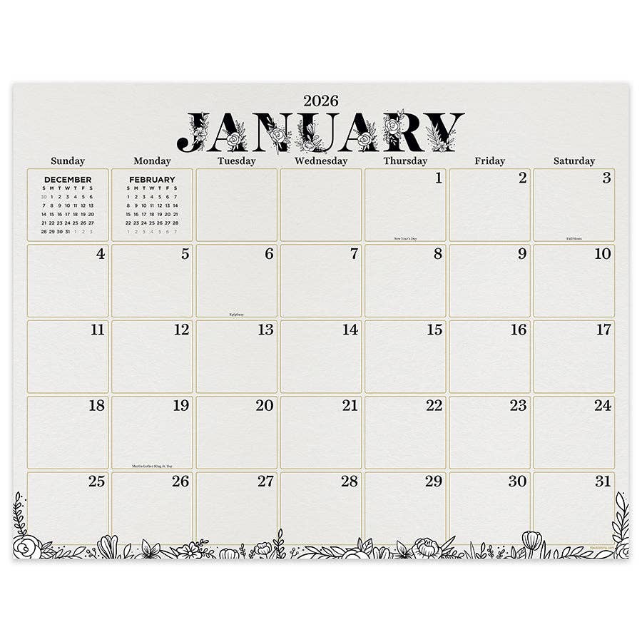 Remember to stop and smell the flowers with our 12-month medium floral desk pad calendar! Monthly tear-off pages are accented with beautiful floral designs that are sure to brighten your day and include large calendar grids with ample writing space for daily appointments, to-dos and reminders as well as a reference of the previous and upcoming months. Spanning January 2026 to December 2026, this desk pad is made with high quality, thick paper allowing for smooth writing and easy erasing. The landscape-oriented calendar measures 17" (w) x 12" (h) with boxes measuring 2.2" (w) x 1.8" (h) and can either lay flat on a desk or has drilled holes to hang on the wall. The desk pad includes corner protectors and is fully recyclable! Printed on FSC-certified paper.