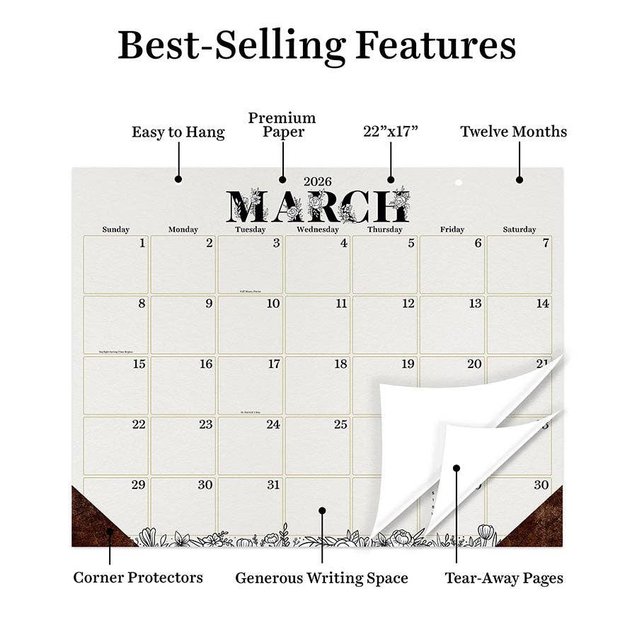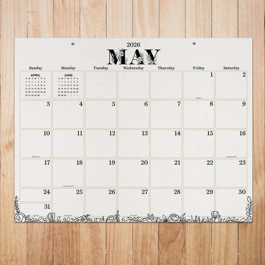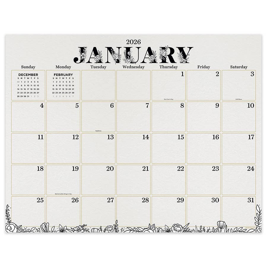 Remember to stop and smell the flowers with our 12-month large floral desk pad calendar! Monthly tear-off pages are accented with beautiful floral designs that are sure to brighten your day and have large calendar grids with ample writing space for daily appointments, to-dos and reminders as well as a reference of the previous and upcoming months. Spanning January 2026 to December 2026, this desk pad is made with high quality, thick paper allowing for smooth writing and easy erasing. The landscape-oriented calendar measures 22" (w) x 12" (h) with boxes measuring 2.9" (w) x 2.6" (h) and can either lay flat on a desk or has drilled holes to hang on the wall. The desk pad includes corner protectors and is fully recyclable!
