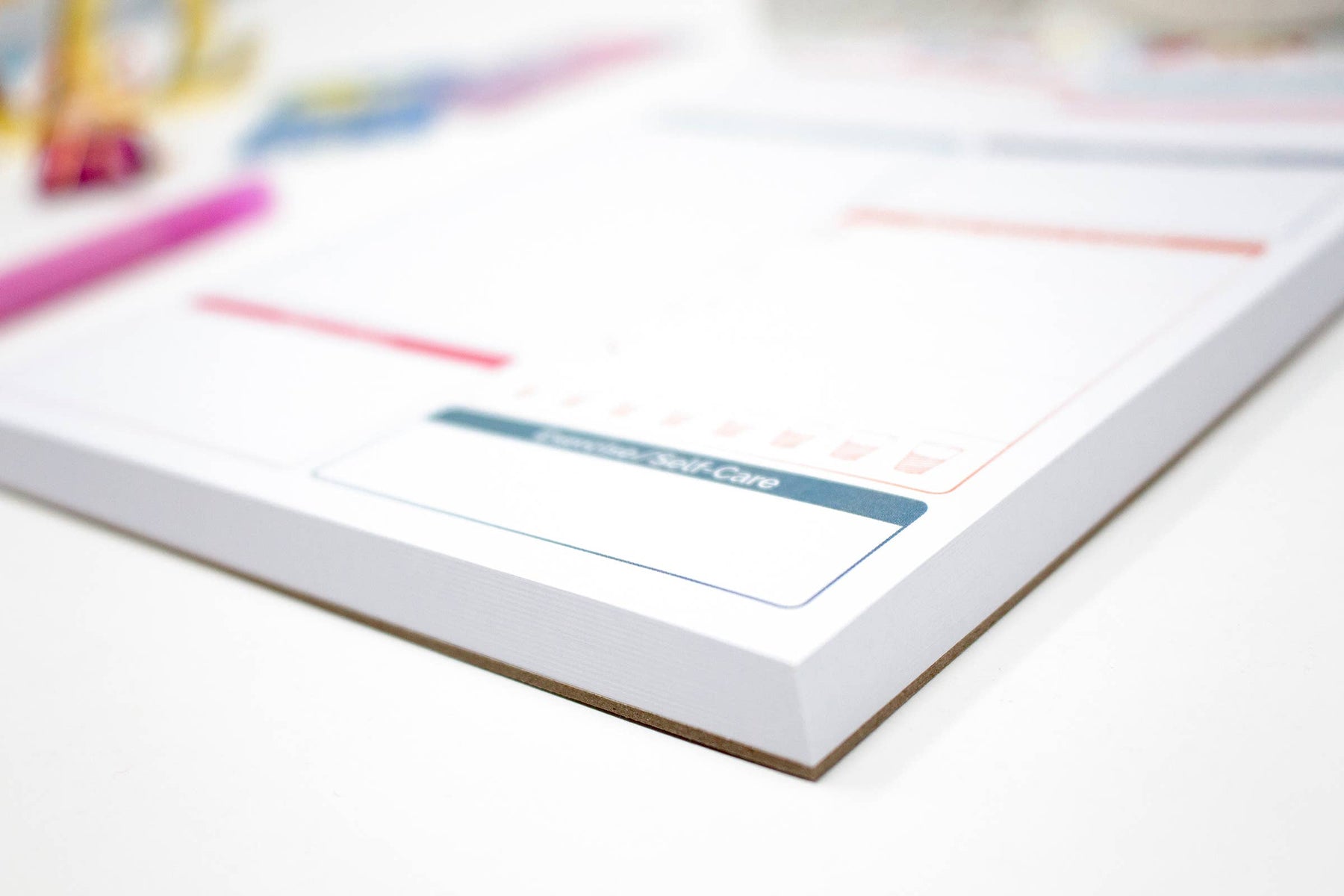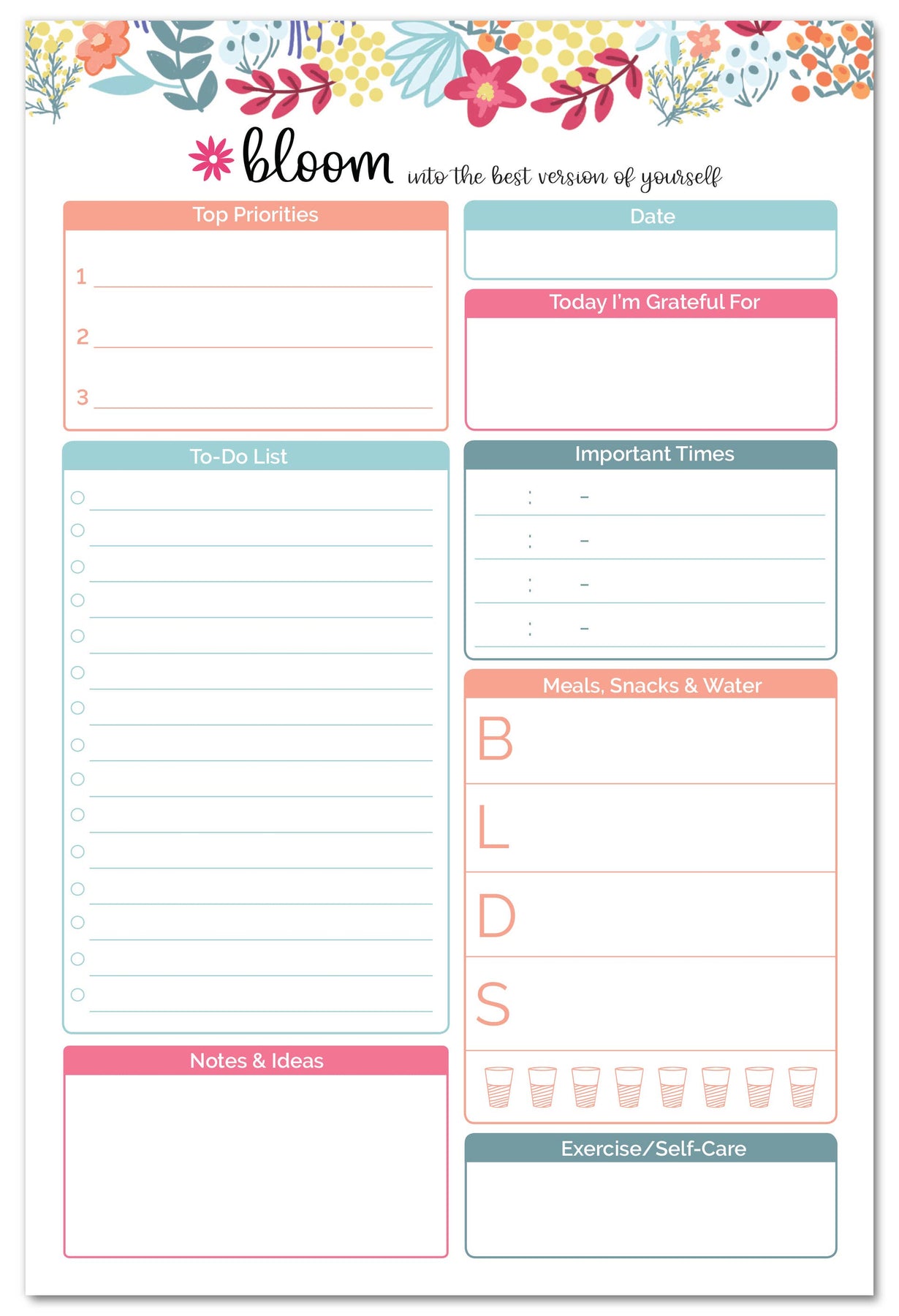 • Daily sections for priorities, tasks, meals, exercise, self-care, and notes